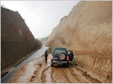黄土高原は細かい粘土質の土からできています。この大地に雨が降ると、わずかの量でも土の表面はズルズルになり非常に滑りやすくなります。車はスリップして通行不能となり(写真左)、雨が続けば道路はえぐられてしまいます(写真右)