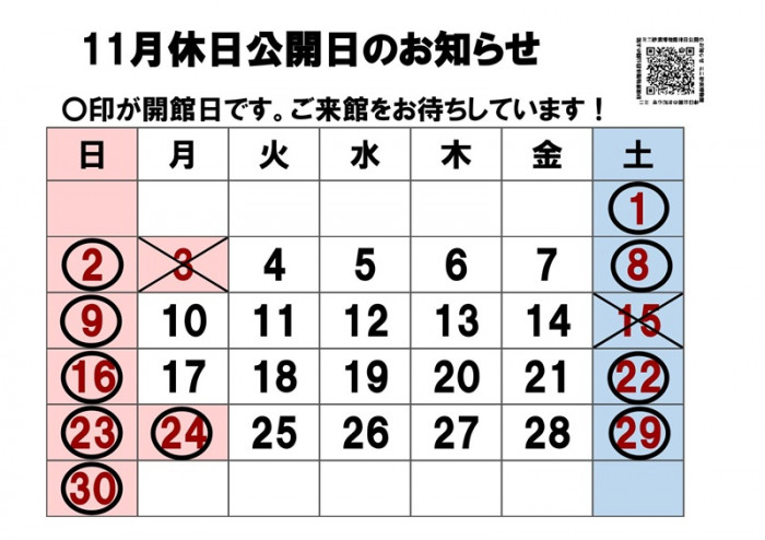 11月のミニ砂漠博物館 休日公開日のお知らせです。